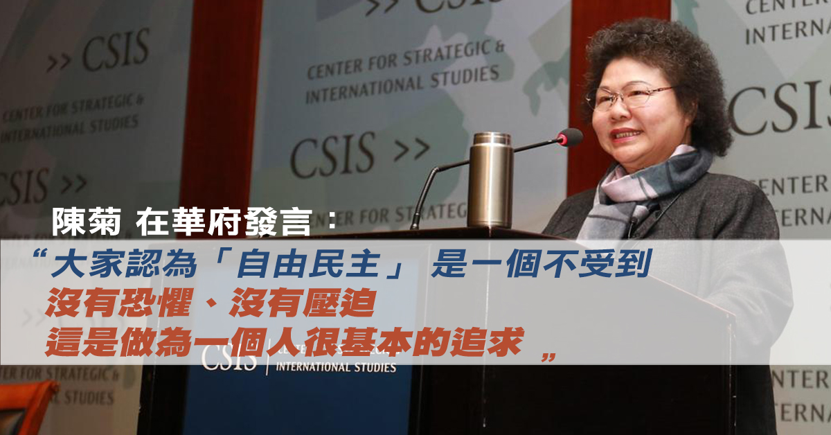 陳菊表示,自由民主是人所追求的基本價值,她希望包括中國大陸在內,全世界都可以享有自由民主基本人權。
