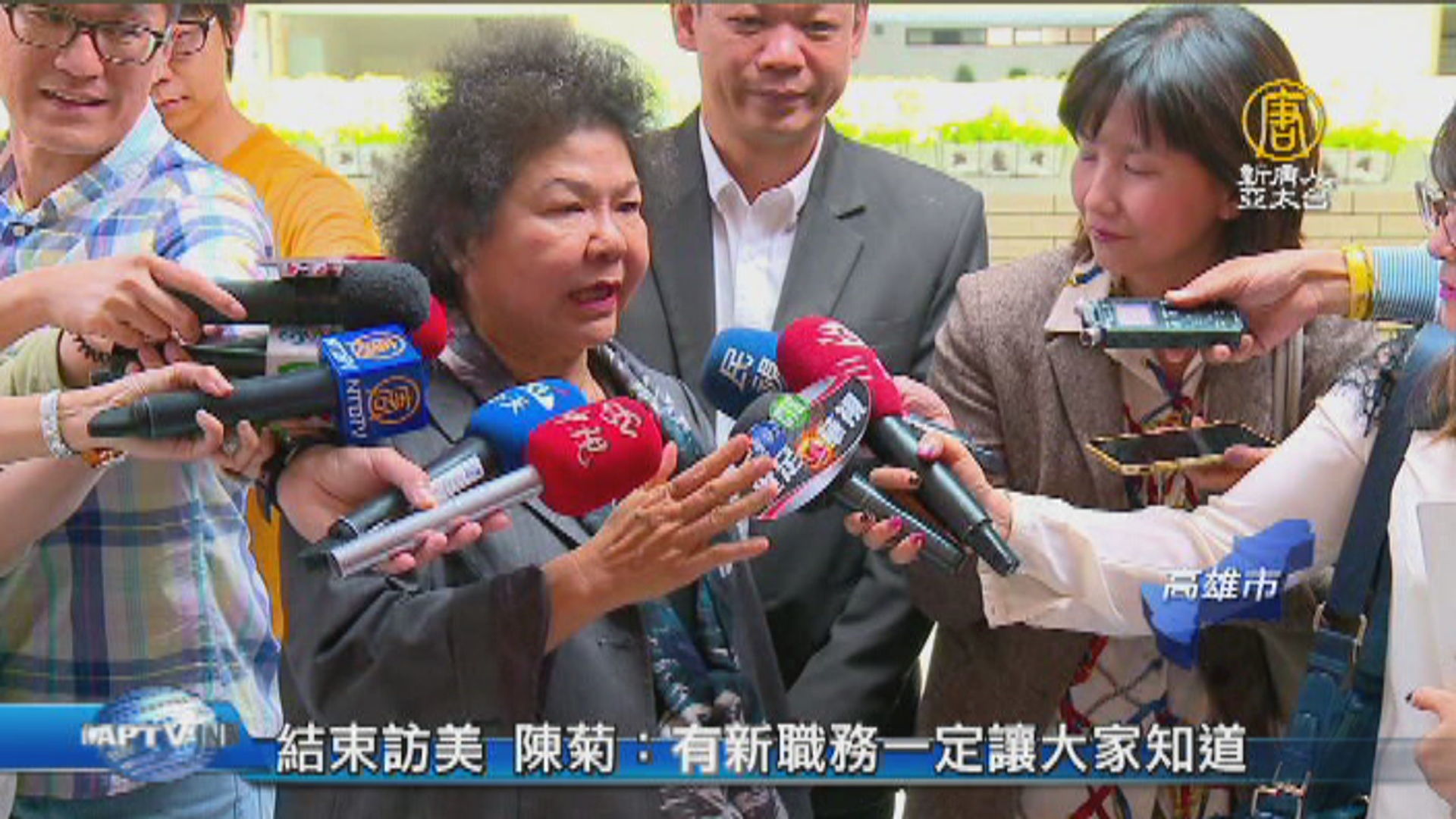 【新唐人亞太台 2018 年 03 月 26 日訊】再來看到,高雄市長陳菊,,完成美國出訪之旅,今天(26日)凌晨5點半,返抵桃園機場後,隨即前往總統府,陳菊下午在市政府受訪表示,上午跟蔡總統見面,是簡單報告訪美行程,並未討論新職務,如果新的職務確定,一定很快讓大家知道。