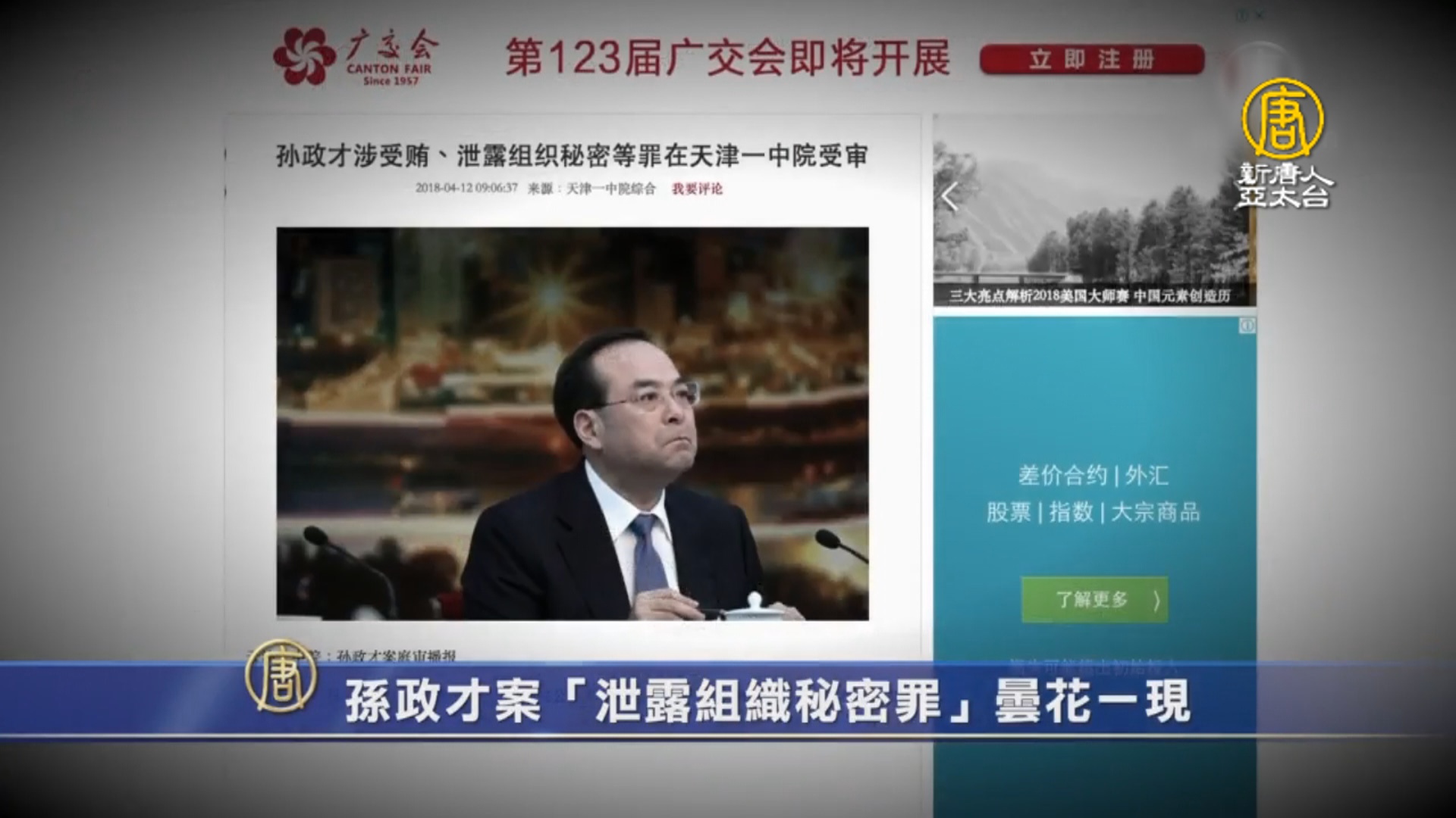 【新唐人亞太台 2018 年 04 月 14 日訊】前重慶市委書記孫政才受賄案,本週四在天津市第一中級法院一審審理。在孫政才的罪名方面,大陸媒體指其「泄露組織秘密」的報導,罕見的曇花一現。