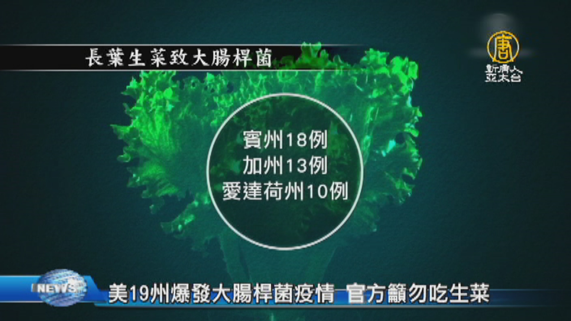 【新唐人亞太台 2018 年 04 月 26 日訊】美國從三月以來,爆發多起吃生菜感染大腸桿菌病例,目前,疫情蔓延到美國19個州,40多人住院治療。官方呼籲民眾,除非確保生菜來源安全,否則近期內,最好不要吃生菜。