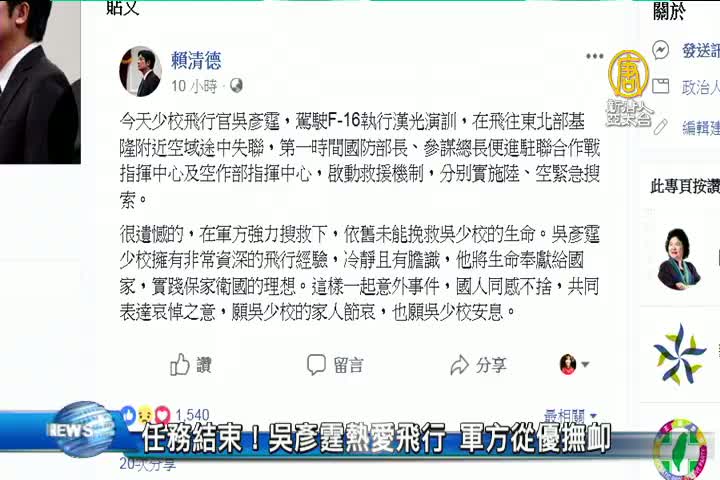【新唐人亞太台 2018 年 06 月 05 日訊】31歲的空軍少校吳彥霆,不幸罹難;他熱愛飛行,從小就想當飛行員,連兒子取名也與天空有淵源;行政院長賴清德昨天表示,吳彥霆將生命奉獻給國家,實踐保家衛國的理想,對這起意外事件,國人同感不捨。而國防部發言人臉書,昨天也刊出吳彥霆所駕駛的編號6685戰機黑白照,上頭標註任務結束,並表示,國防部長已下令全力協助家屬辦理後事,並組成專案小組調查肇事原因,要求確保各項演訓安全。
