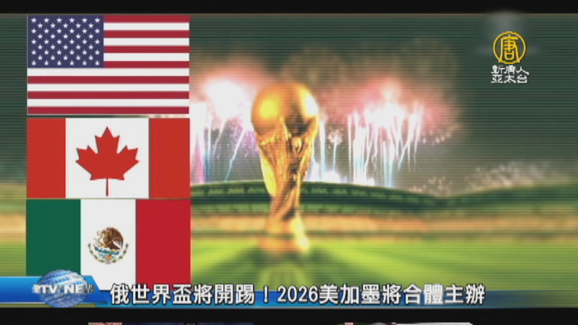 【新唐人亞太台 2018 年 06 月 13 日訊】歡迎回來。四年一度的世界盃足球賽,明天晚上11點,就要在俄羅斯開踢,接下來的1個月,我們將持續帶您關注最新賽況!另外,2026年世界盃的主辦方,也揭曉了!將由美國、加拿大和墨西哥,三國共同主辦。到時候會在三地同時開踢,這也是繼1994年後,相隔32年,北美洲再度主辦世界盃。