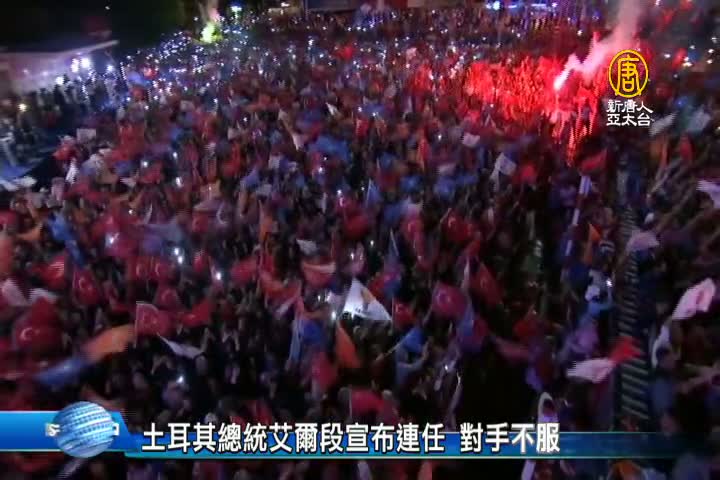 【新唐人亞太台 2018 年 06 月 25 日訊】土耳其總統大選投票今天揭曉,據國營媒體報導,在已經開出96%的選票中,尋求連任的總統 艾爾段贏得53%選票,反對黨共和人民黨候選人 殷斯獲得31%選票,艾爾段已經自行宣布勝選。但反對黨質疑官方數字,指控國營媒體「操控」選舉,艾爾段得票最終未必能夠過半,總統選舉將會進入第2輪決選。不過,土耳其最高選舉議會也已經宣布艾爾段當選的消息。