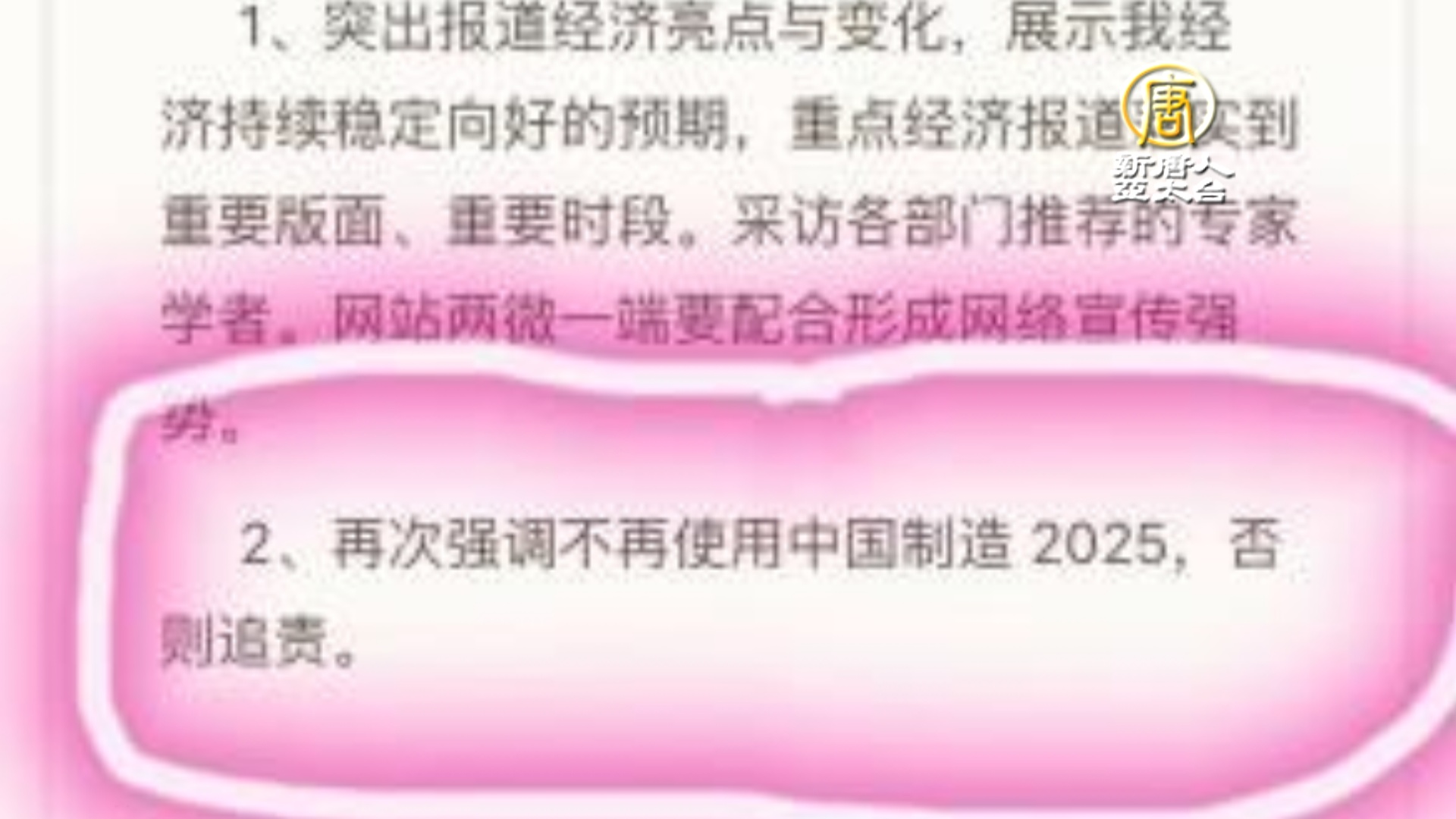 【新唐人亞太台 2018 年 06 月 26 日訊】中國網路昨天傍晚流傳一份疑似官方下達的文件截圖,抬頭是「宣傳口通知」。文件要求陸媒「三不轉」,包括不轉載美國政府言論;不轉載美國媒體關於貿易戰的評論;文件最後再次強調「不再使用中國製造2025,否則追責」。不過這份截圖,很快地就被網管刪除。