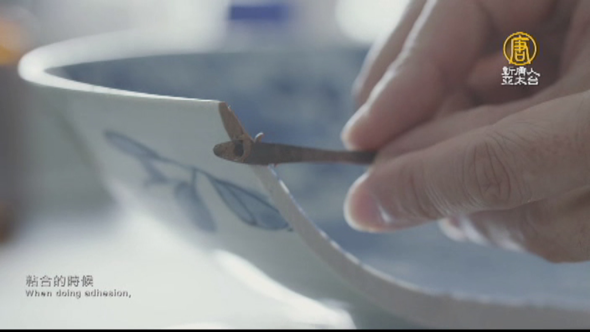 故宮助理研究員 林永欽:「這次的修復方式,主要是以日本傳統瓷器的修復方式為主,它主要包含兩個步驟,一個是破片的黏合,再來是黏合部位的描漆跟敷金,主要使用的材料是天然漆。」