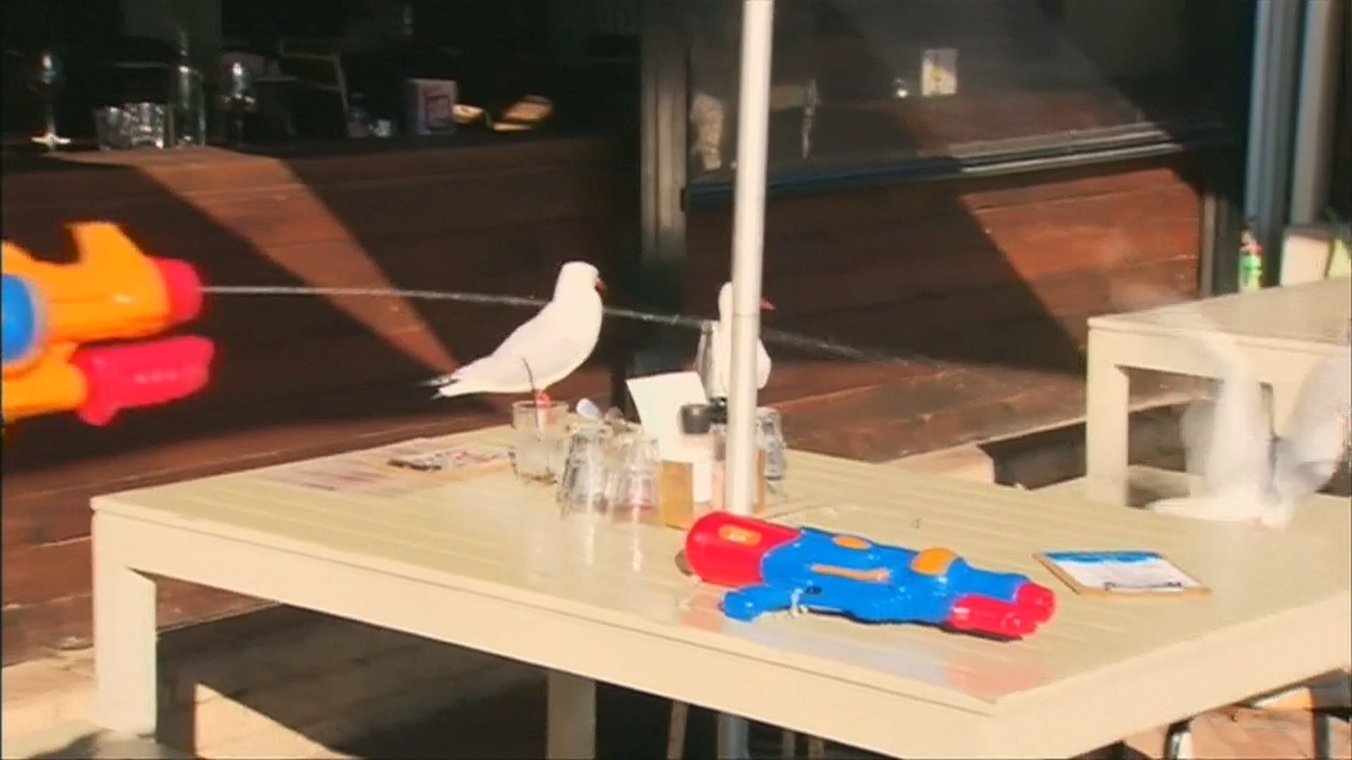 每一桌提供水槍以驅趕想搶奪食物的海鷗,用人道的方式來解決海鷗搶奪食物的情況,這個點子不僅不傷害牠們,也能為用餐帶來一點樂趣。