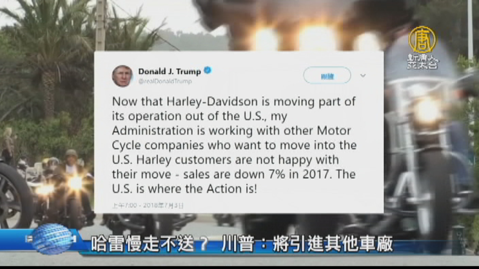 【新唐人亞太台 2018 年 07 月 05 日訊】再來關心,因應美歐互相祭出高關稅,先前,美國著名的哈雷機車公司宣布出走,將部分生產移往海外,但不會移到歐洲。不過美國總統川普可不怕,川普週二在推特發文表示,美國政府正與其他機車廠商合作,引進到美國發展。