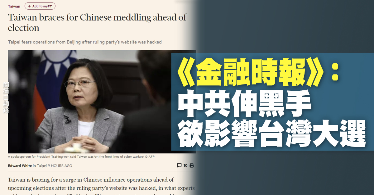 【新唐人亞太台 2018 年 07 月 09 日訊】再來看到,台灣年底即將舉行九合一大選,不過,有外媒報導指出,年底大選疑似遭到中共駭客插手干涉,英國《金融時報》指出,中共正設法干預台灣的選舉,如同先前俄羅斯干預美國大選一樣,企圖把選舉結果導向有利於中國。日前民進黨官網遭到中共駭客入侵,顯示台灣在準備大選時,中共相關行動激增,專家認為這是北京意圖在境外「施展權力」。有專家指出,這種存在於各網頁,社群網站,及手機APP的隱蔽式網路影響力,將會繼續增加。並呼籲世界各國政府,應緊密關切台灣目前正在發生的事。