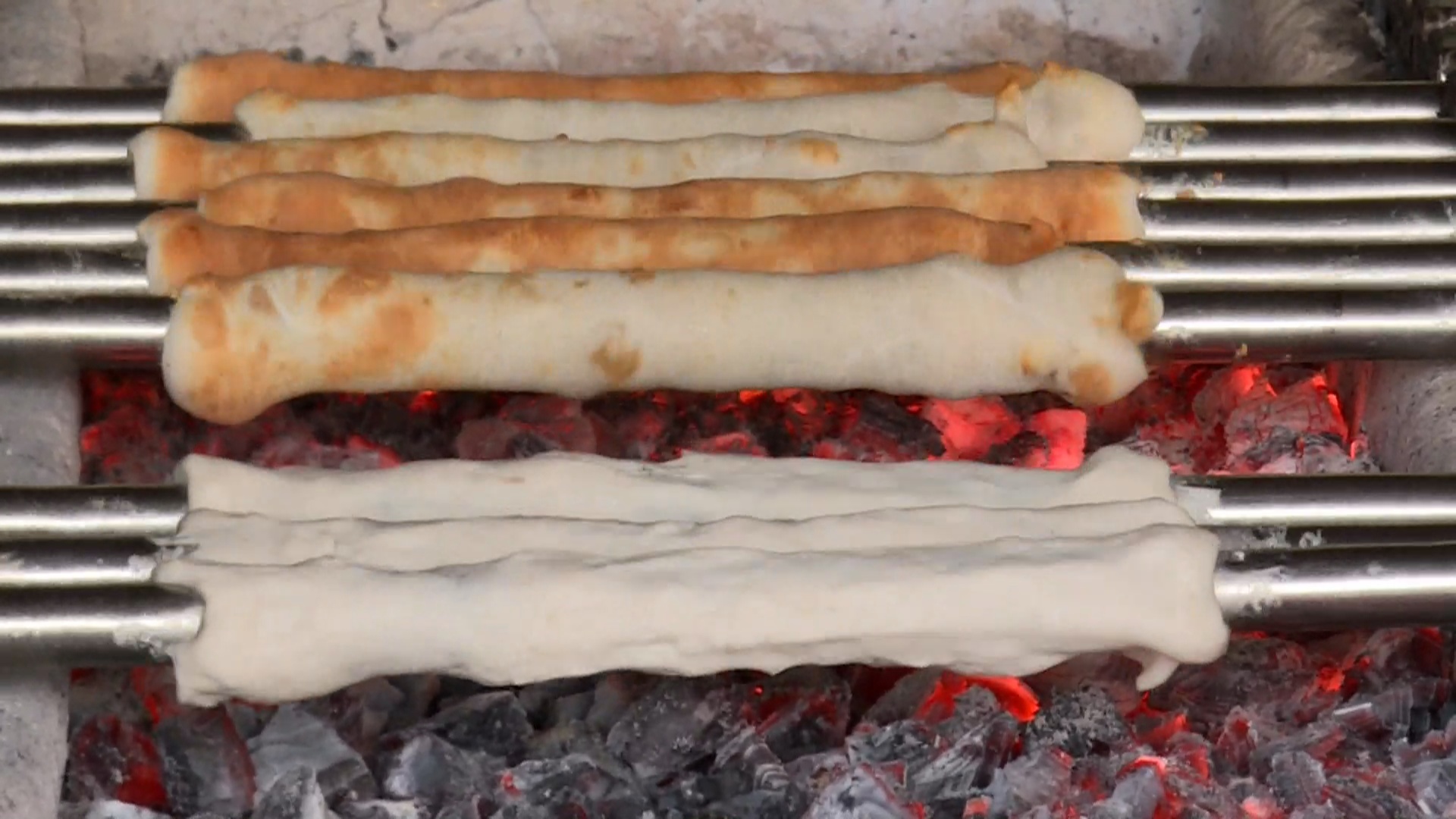 數十根裹著鯊魚漿的不鏽鋼管,在炭火爐上燒烤;站在高溫爐火前,老闆全副武裝,雙手不停地翻動鋼管,不一會兒功夫,咬勁十足的「吉古拉」就出爐了。