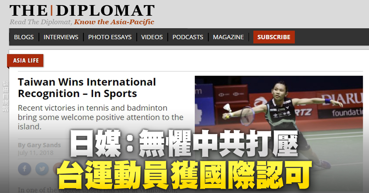 日本《外交家》(The Diplomat)雜誌,於11日,發表美國資深分析師桑茲的文章說,儘管中共不斷在國際上壓縮台灣的生存空間,但台灣運動員近期在比賽中的優異表現吸引全球媒體的關注,也贏得了國際認可。他們的勝利屬於台灣,而不是中華台北。