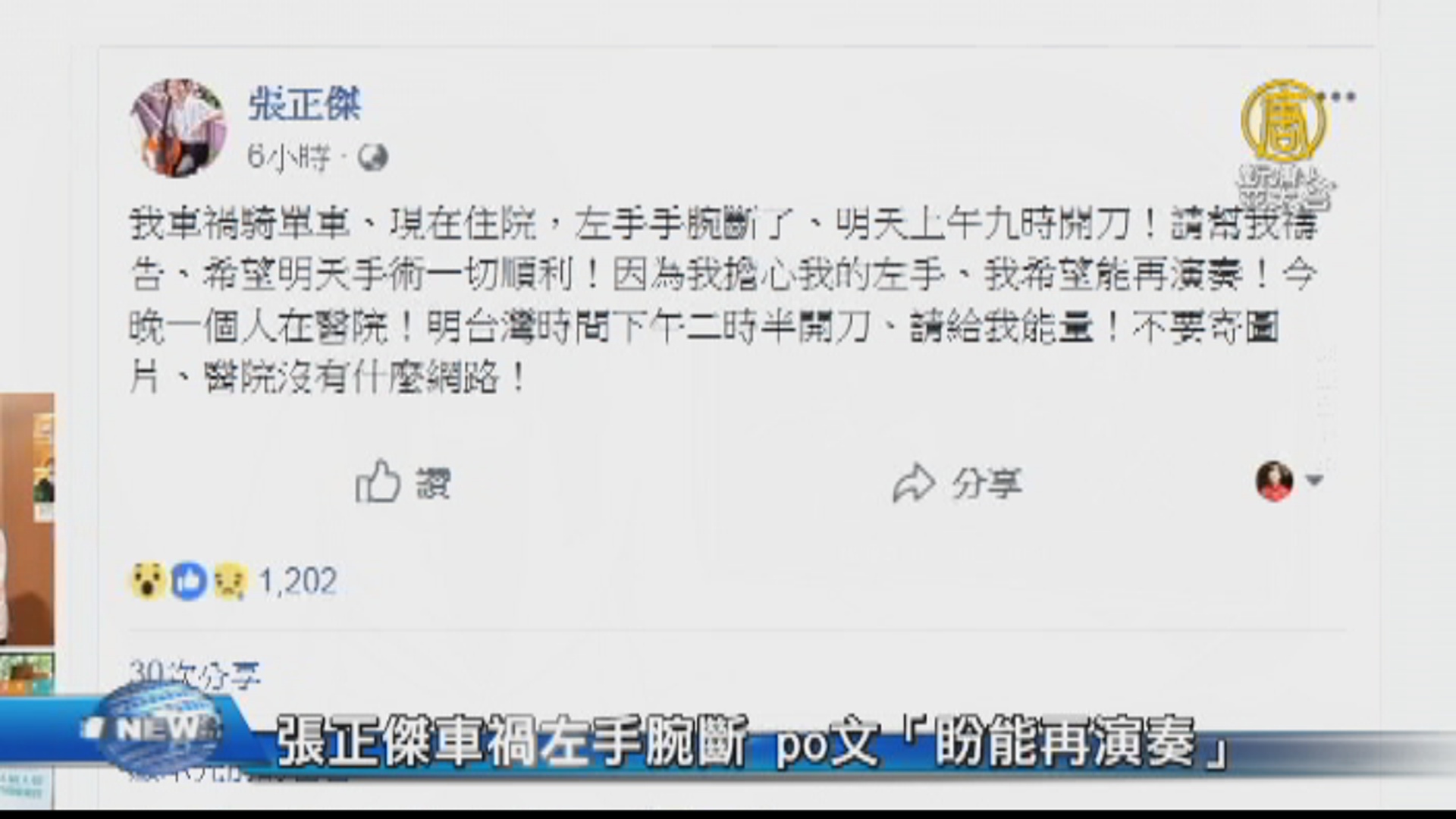 【新唐人亞太台 2018 年 07 月 20 日訊】國內知名大提琴家張正傑,在奧地利驚傳車禍,疑似是左手骨折。他在臉書表示,因為騎單車發生車禍,現在在住院,左手手腕斷了,台灣時間明天開刀。希望網友能幫他禱告,讓手術順利,將來還能繼續演奏。貼文發出後,短短3個小時,已有超過300多則的留言替張正傑加油打氣。
