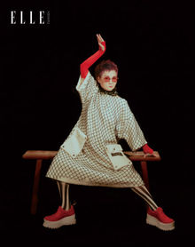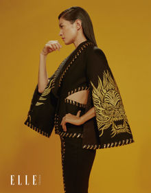 黃子佼說,自己不僅穿上台灣設計師周裕穎以〈唐 懷素 自敘帖〉設計的衣服,也請出師父張小燕、Janet共襄盛舉,由ELLE團隊掌鏡拍攝。
