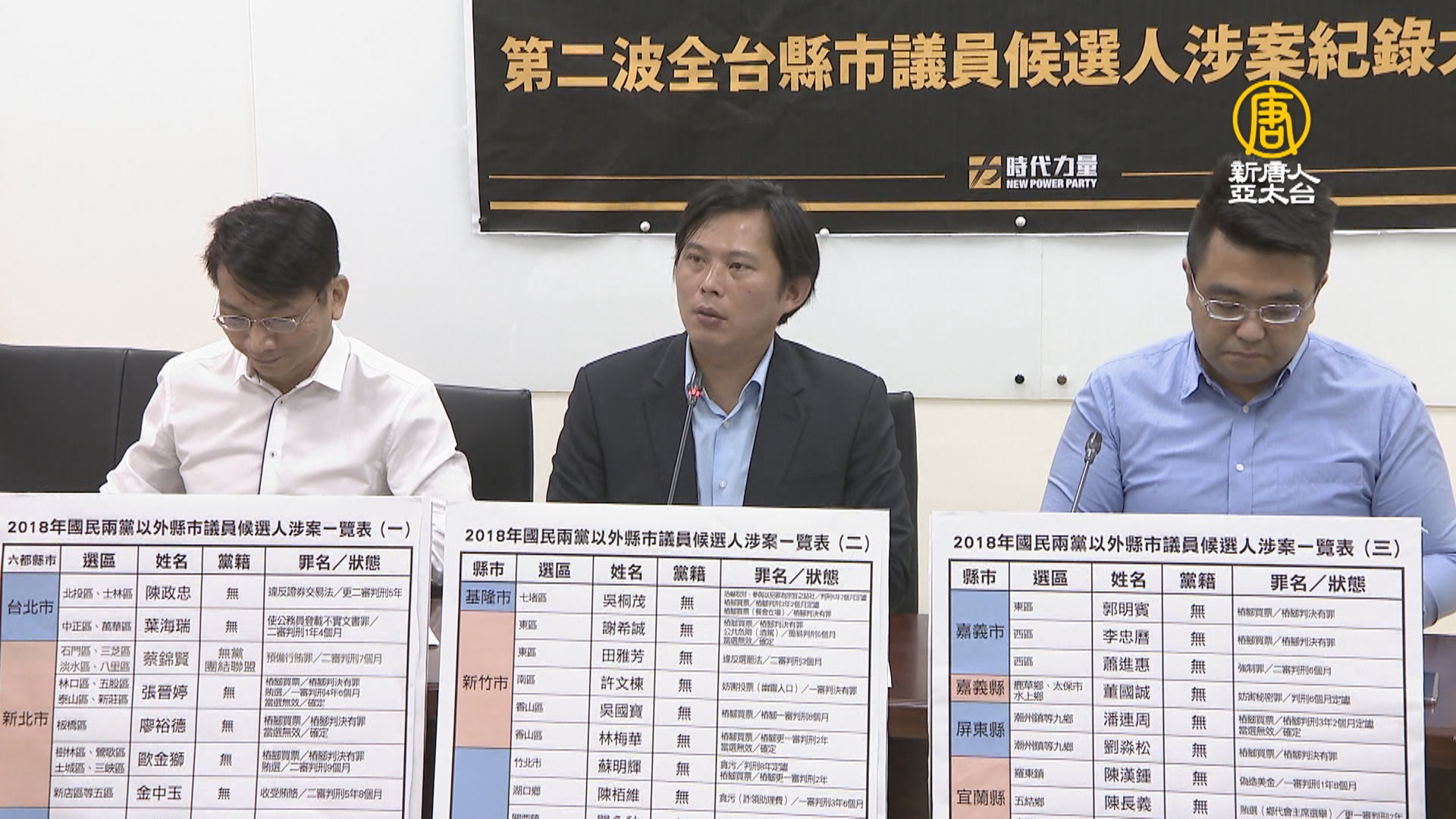 【新唐人亞太台 2018 年 10 月 18 日訊】年底選舉不少議員候選人打著無黨參選、無色覺醒,不提過去涉案紀錄,時代力量週四(18日)公布無黨籍跟小黨議員參選人涉案名單,涉嫌貪汙的有14位,各種選舉舞弊的最多,高達42人,還有打著無色覺醒的旗號標榜正義,時代力量指出,這樣的司法紀錄應該刊登選舉公報。