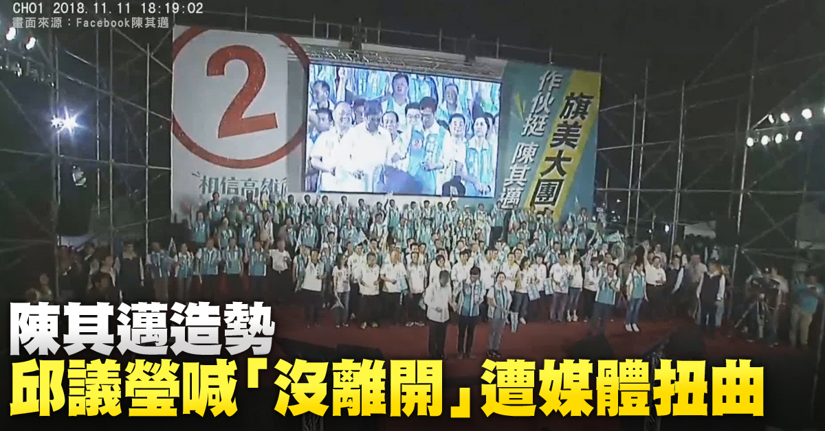 民進黨高雄市長候選人陳其邁11日晚間於旗山舉辦「旗美大團結」造勢活動,主持人邱議瑩,用台語感謝「大家沒有離開」,卻被媒體扭曲,報導成「主持人拜託大家不要離開」,陳其邁下午回應時,再三強調影片會說話。