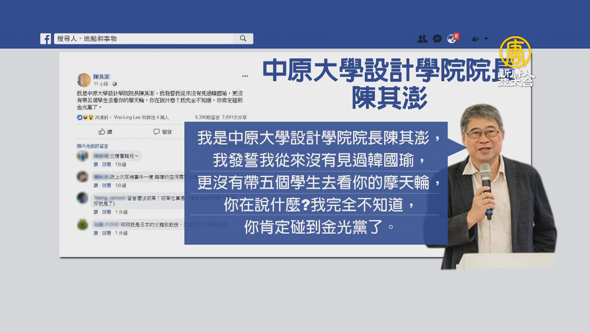 這話一出,立刻被中原大學設計學院院長陳其澎打臉,他發誓從來沒有見過韓國瑜,韓國瑜肯定碰到金光黨。沒想到陳其澎的澄清,被韓粉狂洗版,罵陳其澎自己對號入座。