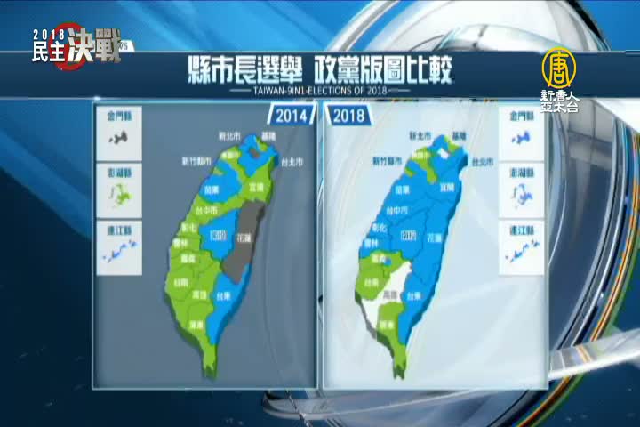 【新唐人亞太台 2018 年 11 月 24 日訊】好,九合一選舉落幕,藍綠板塊可能又要位移,2014年民進黨拿下四都13縣巿,在地方執政過半。國民黨六都僅剩新北巿。不過現在,局勢可能翻轉,國民黨已經拿到過半11縣市,目前民進黨陣營宣布敗選的縣市,六都已經有新北、台中,而宜蘭,彰化,雲林,新竹縣和嘉義市,則是由綠地變藍天,離島也全部都是國民黨當選。而北高兩地,票數則是呈現拉鋸當中,相當緊張。由於執政黨民進黨,六都可能只剩下兩都,22縣市也只剩下三成,有消息傳出,行政院長賴清德晚間10時將宣布內閣總辭,要為敗選負責。