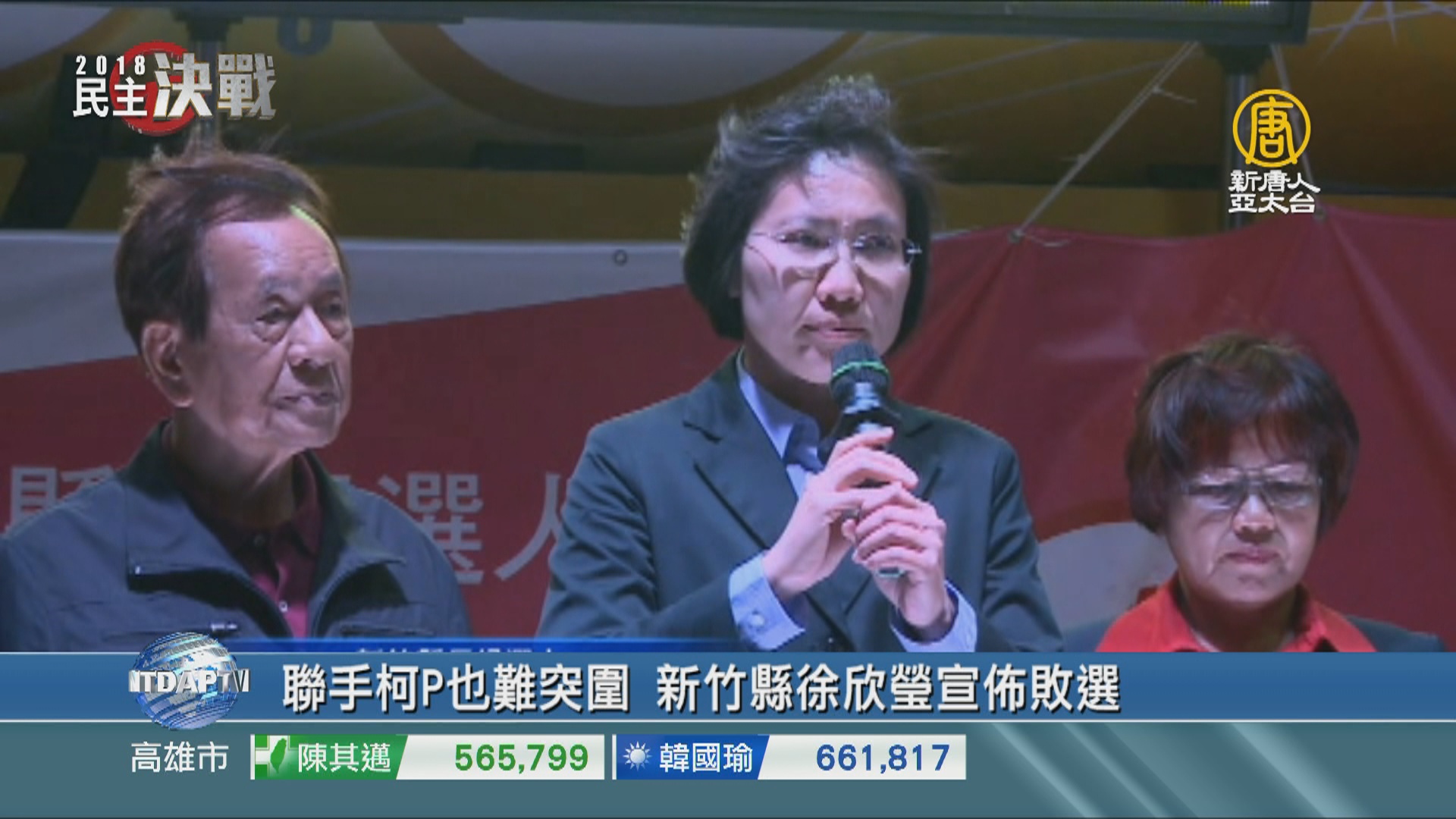 【新唐人亞太台 2018 年 11 月 24 日訊】好,關心新竹縣選情,獲得台北市長柯文哲力挺的徐欣瑩,只獲得8萬多票,與國民黨的楊文科,差距一萬多票,徐欣瑩已經在7點半自行宣佈落選,帶您看看稍早的畫面。