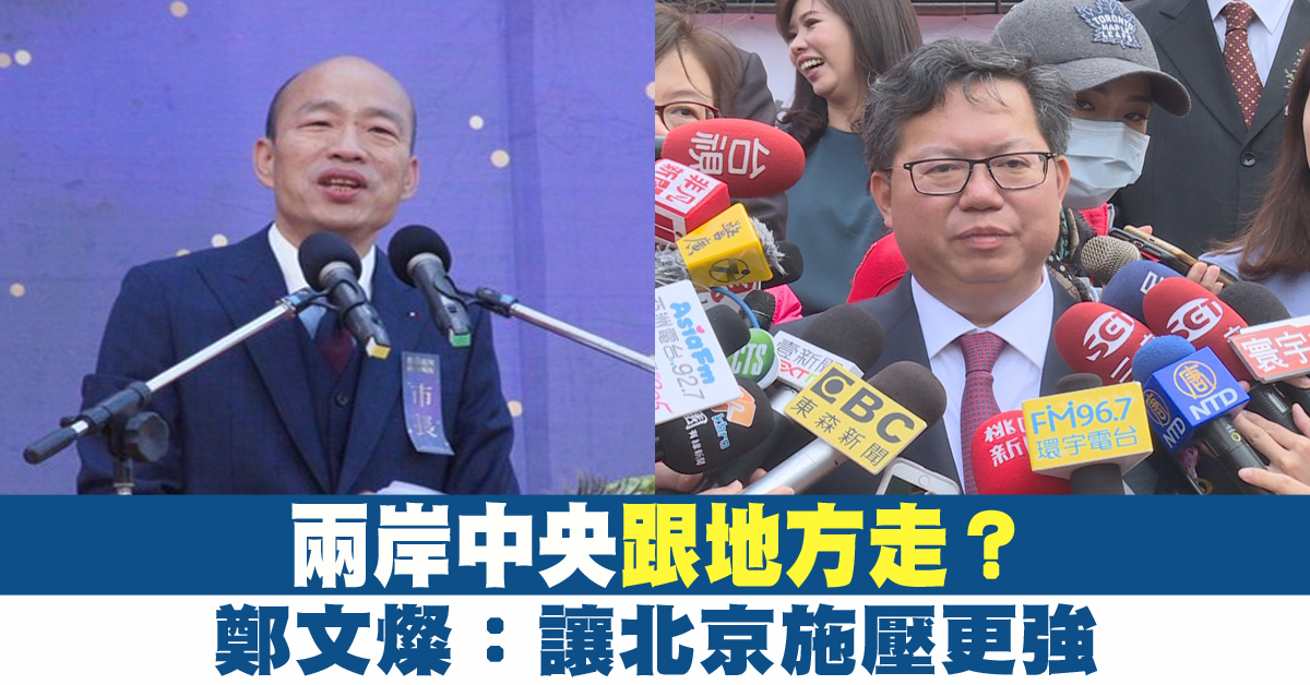 【新唐人亞太台 2018 年 12 月 25 日訊】好,高雄市長韓國瑜正式上任,媒體聚焦他的兩岸主張,對於前一天陸媒報導,「兩岸政策,中央跟著地方走」的說法,韓國瑜說是被曲解,他不會取代中央職權,但經濟上希望尊重地方。桃園市長鄭文燦表示,若地方政府壓縮中央的決策空間,或採取中共立場,那台灣的立場就變得很困難。