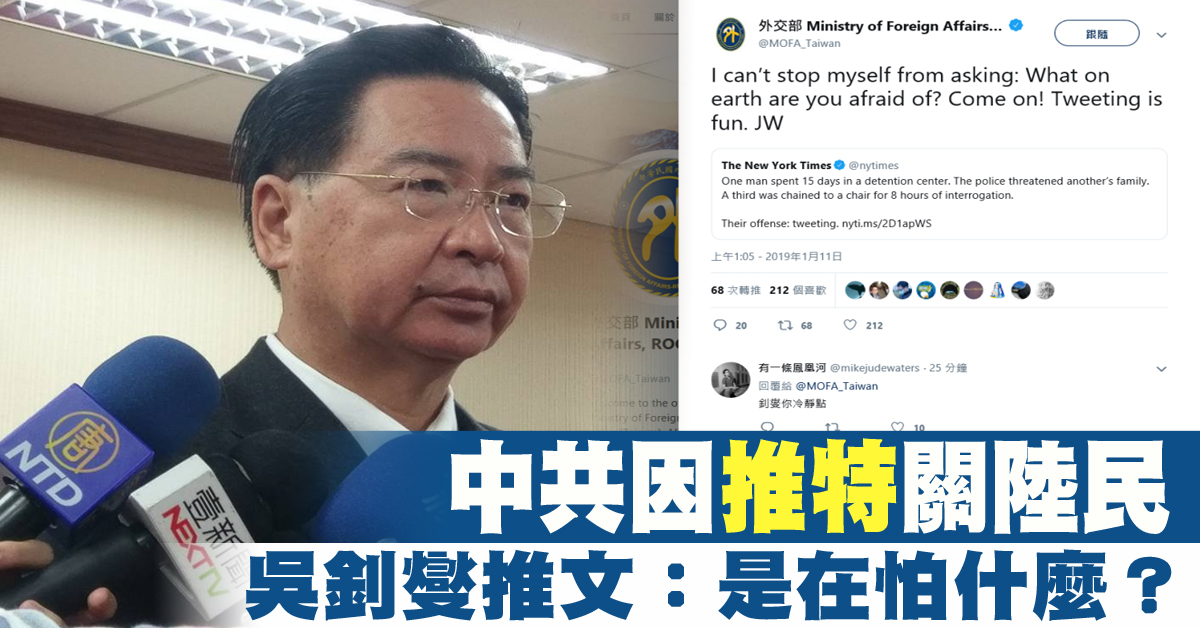 外媒報導,一名中國大陸民眾用推特發表異議,被關在拘留所15天,甚至家人都遭到威脅,中華民國外交部長吳釗燮在外交部推特表示:「你們到底是在怕什麼?發推特是很好玩的。」這也是繼「強迫統一是愚蠢的」、「連自己的豬都管不好」後,又一嗆辣發言。