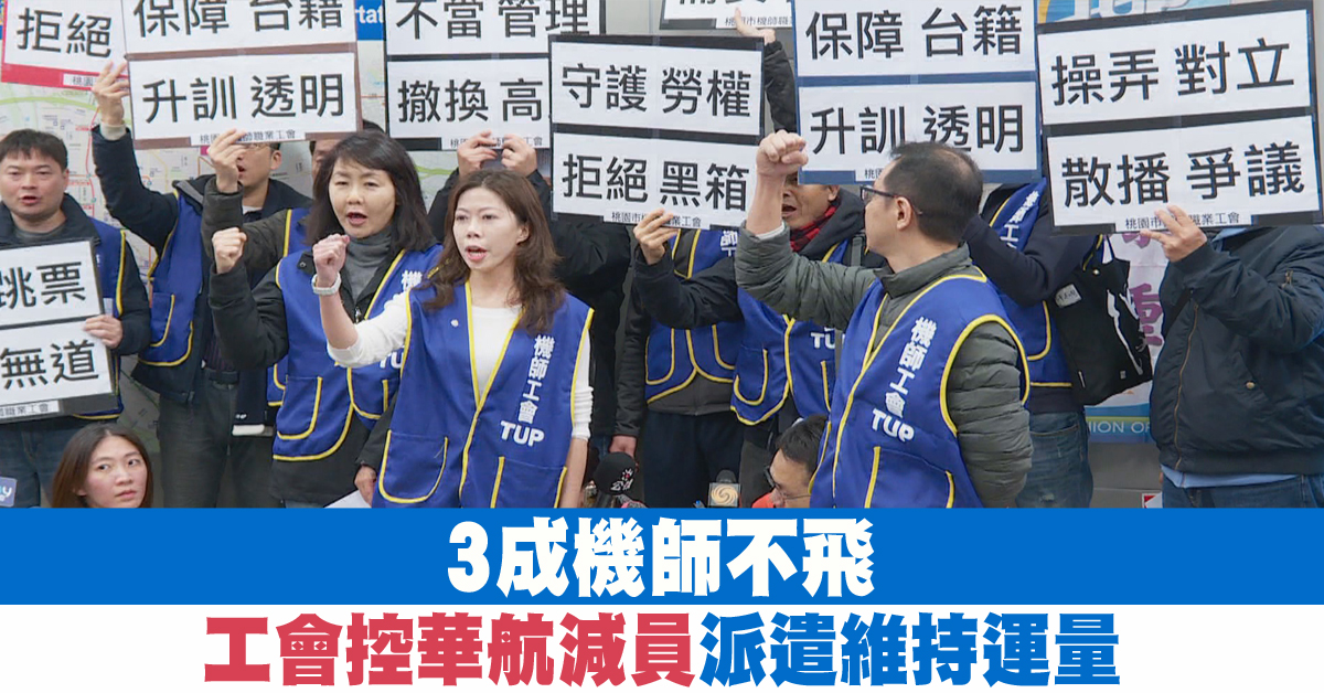 2019-02-10 21:37:36機師工會無限期罷工,目前有將近6百名華航機師參與罷工,今天(10日)取消22個航班、3千8百名旅客受影響。而9日晚間勞資談判沒有共識,工會堅持七小時航班必須派遣三人,如果華航沒有讓步,暫時不會回到談判桌。不過也有華航員工不滿工會罷工的行為,有如綁架乘客,更無視公司存活,(10號)下午動員兩百員工到交通部前抗議。