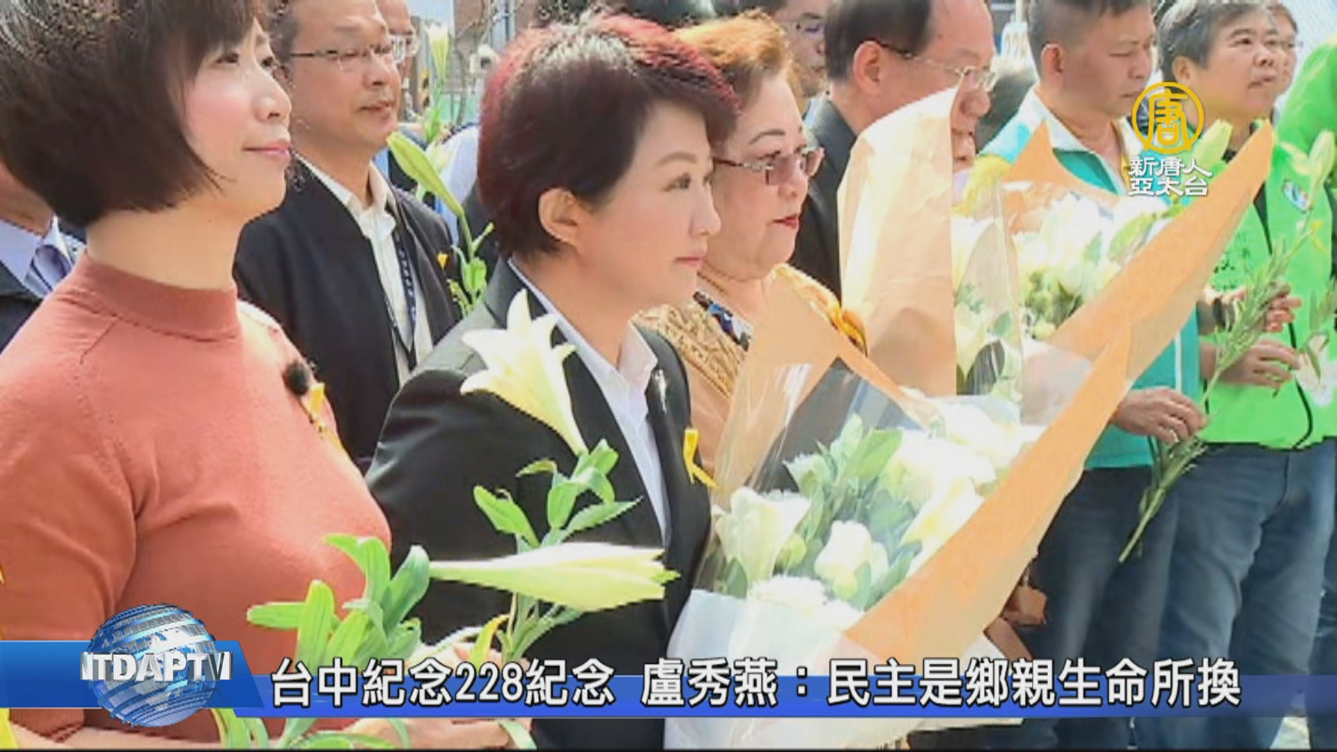 【新唐人亞太台 2019 年 02 月 28 日訊】今天是228紀念日,台中市長盧秀燕也到國光公園紀念碑前獻花,她說 ,歷史不會忘記,但期許二二八事件的悲傷,能夠以和平的方式在人民心中劃下句點。??
