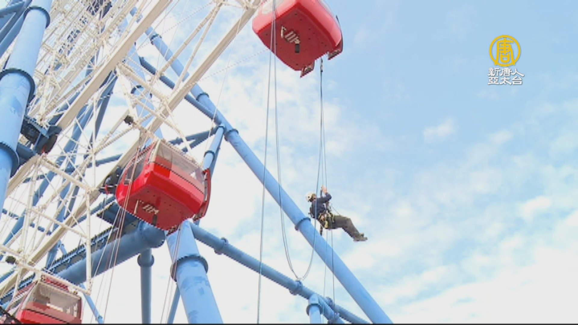 一聲令下,沿著繩索往上爬,登上5層樓高摩天輪車廂,進行救援任務。