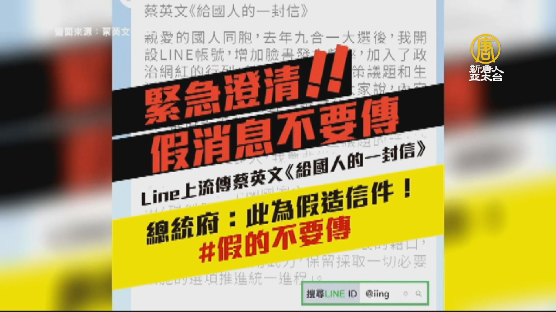 【新唐人亞太台 2019 年 03 月 08 日訊】近日網路上流傳一則《蔡英文給國人的一封信》的網路文章,對此,總統蔡英文昨天晚間緊急在官方LINE帳號澄清,強調這封信不是她寫的,呼籲大家不要轉發假訊息,目前,全台灣LINE使用帳號多達2100萬個。