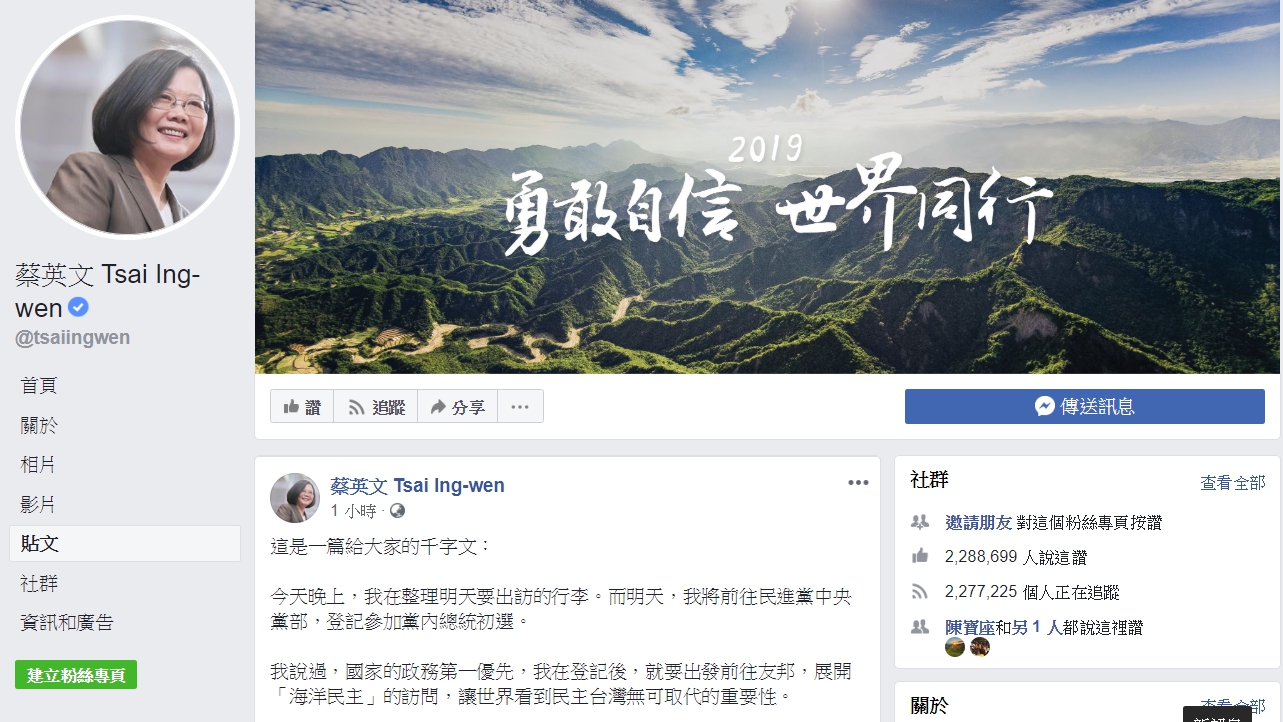 【新唐人亞太台 2019 年 03 月 21 日訊】蔡總統晚間在臉書發表千字文,強調身為現任總統,競選連任是她的責任。「如果我放棄連任,就表示連我自己都否定過去三年的執政。我有責任帶領台灣,往正確的道路繼續走下去。」。