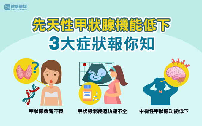 潘妤玟醫師說明,造成先天性甲狀腺機能低下的原因,可分為幾大類,包括:(一)甲狀腺發育不良(二)甲狀腺素製造功能不全(三)中樞性甲狀腺功能低下。(圖/健康傳媒製作)