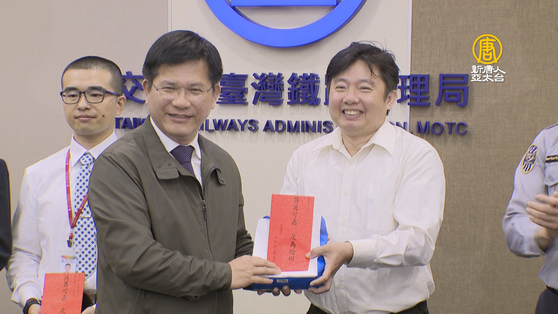 【新唐人亞太台 2019 年 03 月 29 日訊】松山火車站發生乘客揮刀事件,還好有熱心民眾和台鐵人員,合力制伏嫌犯,避免一場可能發生的血腥風暴。上午,交通部長林佳龍特地表揚7名有功人員,包括拿背包砸嫌犯的「正義哥」鄭瑋文,林佳龍也強調,其實「最強大的力量,不是傷人的武器,而是善良的勇氣」。