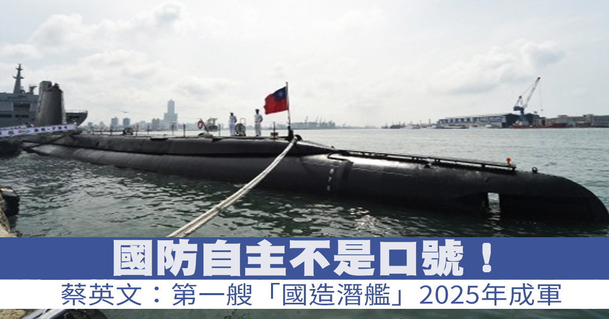 總統蔡英文週三透過臉書宣布:「台灣第一艘『國造潛艦』預計2024年下水,2025年正式成軍。我國海軍即將進入新時代,她強調,「只要有決心,國防自主就不會是口號。」