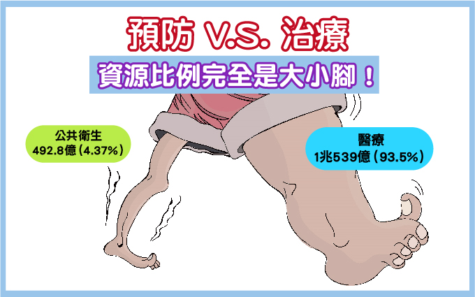 台灣健保舉世聞名,似乎也養成國人愛看病的陋習,據統計,107年國人醫療保健支出超過1兆元,醫療卻占9成以上,至於預防疾病的公衛卻占不到5%,社團法人臺灣公共衛生促進協會批評這本末倒置,全民健康前景堪憂。