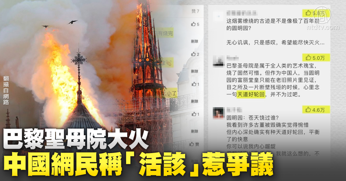 世界文化遺產,擁有八百多年歷史的巴黎聖母院發生大火,法國人痛心落淚,不過在大陸社交媒體上,卻有不少網民宣稱,百年前英法聯軍火燒圓明園,如今巴黎大火是輪迴報應。類似言論,竟都收到4、5萬網民點讚。引發外媒側目。