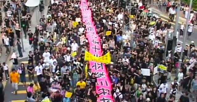 3天之後,也就是7月1日,是香港被收回6週年的日子。這天,香港的街道上人山人海,50萬市民不畏酷熱走上街頭。他們打著他們的橫幅和標語,抗議港府執意推動23條立法。