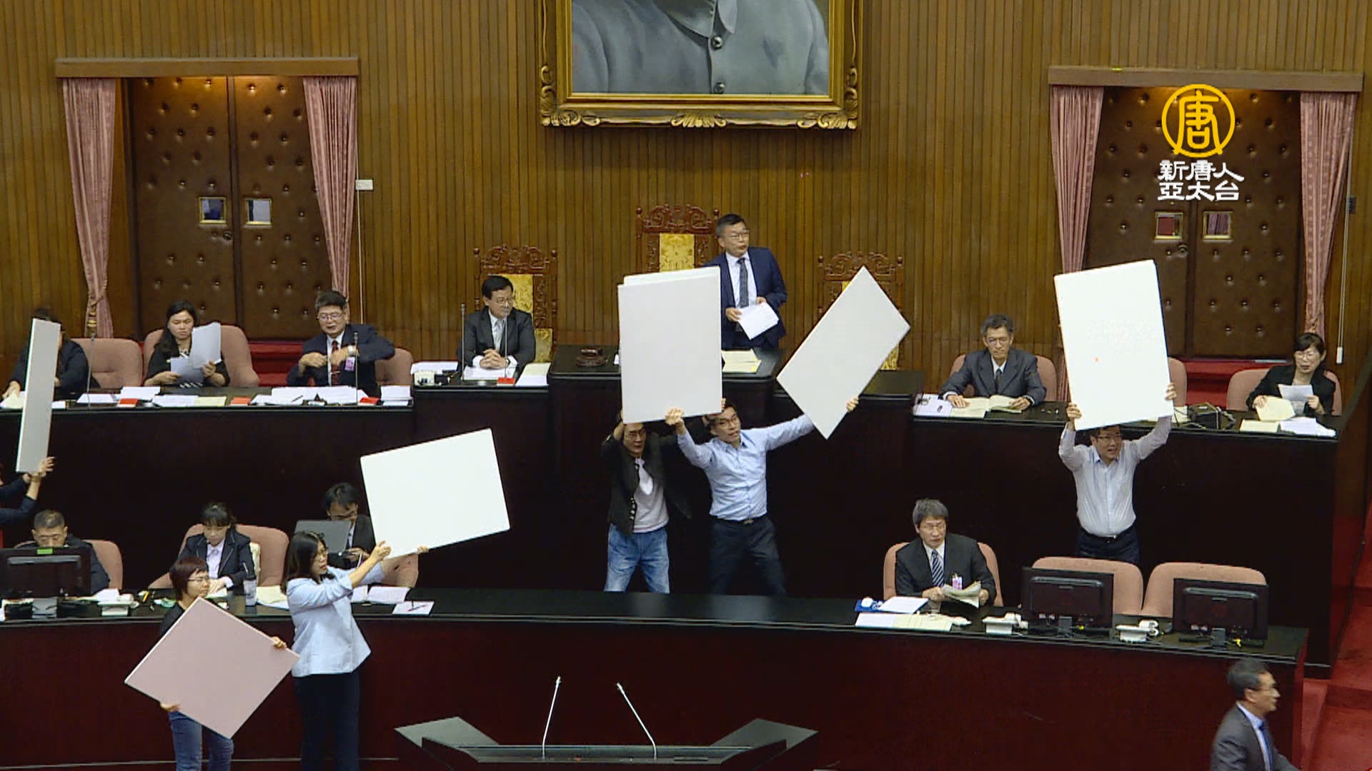 公投法修法表決大戰,變成水球大戰,藍營丟,綠營擋,主席台後的孫文遺像也遭殃。