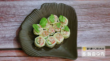 3.將二片高麗菜葉鋪平,將小黃瓜、蟹肉、牛蒡絲、苜蓿芽平鋪後捲起切段。