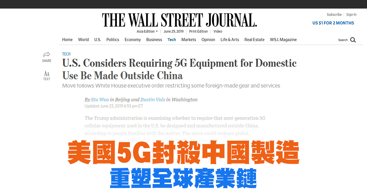 【新唐人亞太台 2019 年 06 月 25 日訊】G20高峰會即將登場,不過美中科技戰態勢也更加明朗,外媒報導,白宮評估,要規定美國境內5G設備,必須在中國以外地區設計、生產。外媒報導認為,將可能形塑全球產業鏈大洗牌,而台灣相關5G概念股,也紛紛傳出打入美國供應鏈,在中國以外產能建置完成下,成為轉單受惠族群。