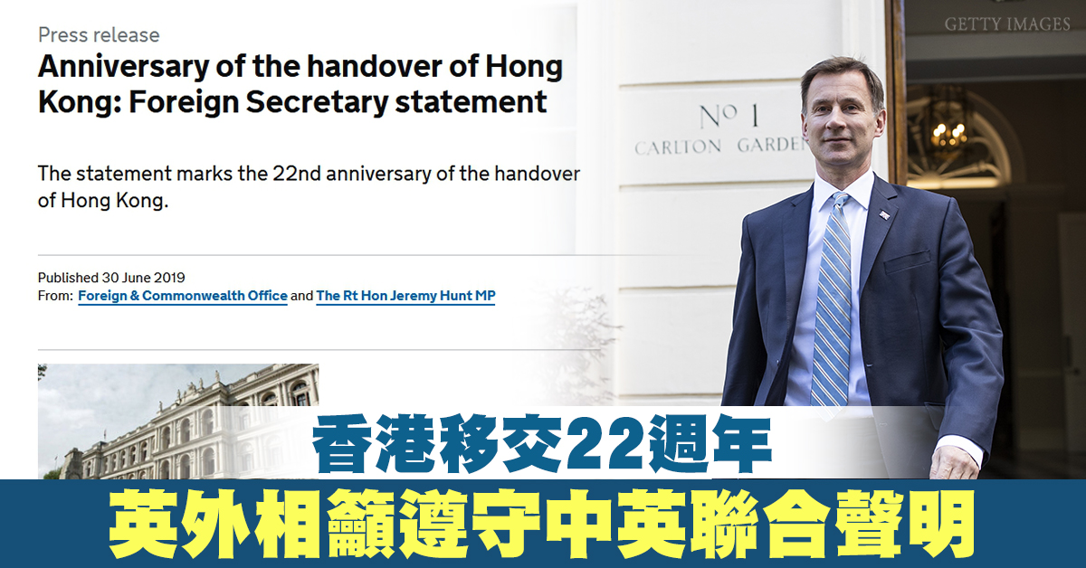 英國外交部官方網站,在七一前(6月30日)發表聲明,英國外交大臣韓特(Jeremy Hunt)指出:香港的高度自治,以及香港人的權利和自由,必須按照《中英聯合聲明》和《香港基本法》得到充分尊重。我們已經公開和私下向中共表態,而且也會一直這樣做。
