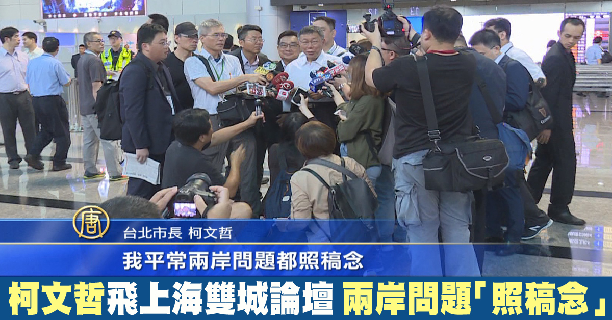 【新唐人亞太台 2019 年 07 月 03 日訊】台北市長柯文哲今天(3日)率團啟程前往上海,參加明天的台北、上海雙城論壇,可能是因為過去的兩岸論述引發爭議,柯文哲這次在機場受訪時[cut特別]全程「照稿念」,他說,平常談兩岸問題,就是都照稿念。