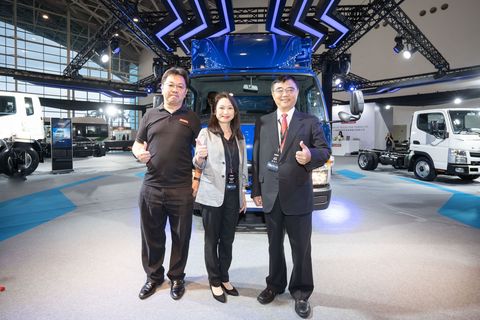 台灣戴姆勒亞洲商車DTAT總經理殷見萍(中)、營運長陳鴻基先生(左)及裕益汽車董事長游浩乙。(台灣戴姆勒亞洲商車提供)