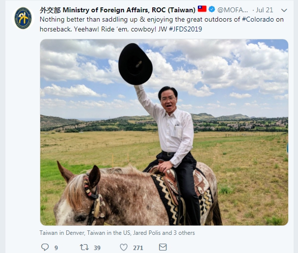 相轎下,中華民國外交部從2018年3月起經營推特,16個月以來,與各國政要透過推特互動。外長吳釗燮,也頻頻親自署名推文,表達對普世價值的堅持,與國際友人互動、以及頻頻聲援支持中國大陸人民、香港民眾的基本權利。例如,吳釗燮六次發文,聲援香港人反送中;也多次發文抨擊中共打壓中國各種宗教的行動。