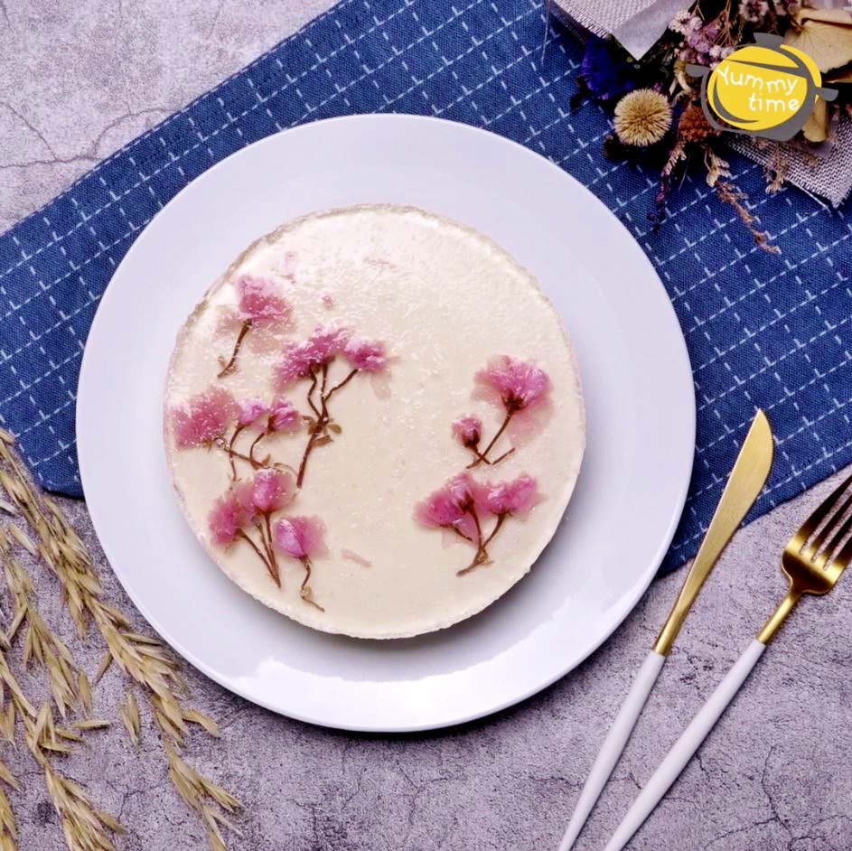 10. 將9.倒入模具中,調整櫻花的排列,放入冰箱冷藏1~2個小時,至鏡面凝固即可。