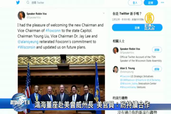【新唐人亞太台 2019 年 08 月 17 日訊】歡迎回來,科技大廠鴻海集團15號舉行了中元普渡祭拜,由副總裁吳惠鋒主持,而創辦人郭台銘沒有現身,董事長劉揚偉則是遠赴美國,拜訪威州州長以及當地官員。隨後,威州的官員就在推特寫道,很開心能跟董事長劉揚偉見面,並且很感激收到鴻海計畫的更新資訊,期待未來能與鴻海持續合作。