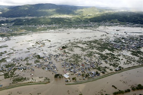 截至今天上午9時,已知關東甲信、東北地區共有14條河川氾濫,許多城鎮嚴重淹水。流經長野縣的千曲川潰堤氾濫,導致多處民宅區嚴重淹水,從日本放送協會(NHK)電視畫面可看到,自衛隊出動直升機從民宅救出受困居民,還有民眾等待救援。