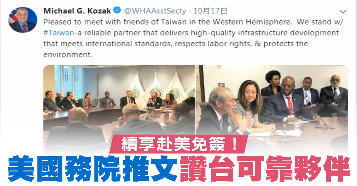 美台友好,除了續享免簽之外,日前美國國務院西半球事務局的代理助卿柯札克,也在推特發文,重申美國與台灣站在一起,並稱讚台灣是可靠的夥伴。他還PO出會議照片,可以看到中華民國駐美代表高碩泰,與7個友邦部長級以上官員在華府召開會議,商談強化與台灣在西半球友邦國家合作。