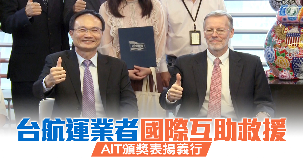 美國在台協會處長 酈英傑:「今天我們在這裡表揚33艘來自10家台灣航運公司的船員,他們參與了美國海岸防衛隊自動互助船舶救援系統,又叫 Amver系統的計劃,這項系統展現了美台在海事安全領域,一直有著密切的合作,也突顯了台灣對國際社會的重要貢獻。」