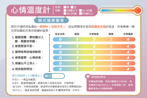 量表中簡單5個問題再加上1題自殺意念評估,總分20分,分數越低表示越健康,6至9分為輕度情緒困擾,建議找親友聊聊抒發情緒;10至14分為中度情緒困擾,建議尋求紓壓管道或找專業心理諮詢;15分以上為重度情緒困擾,建議找身心科醫師進一步評估。