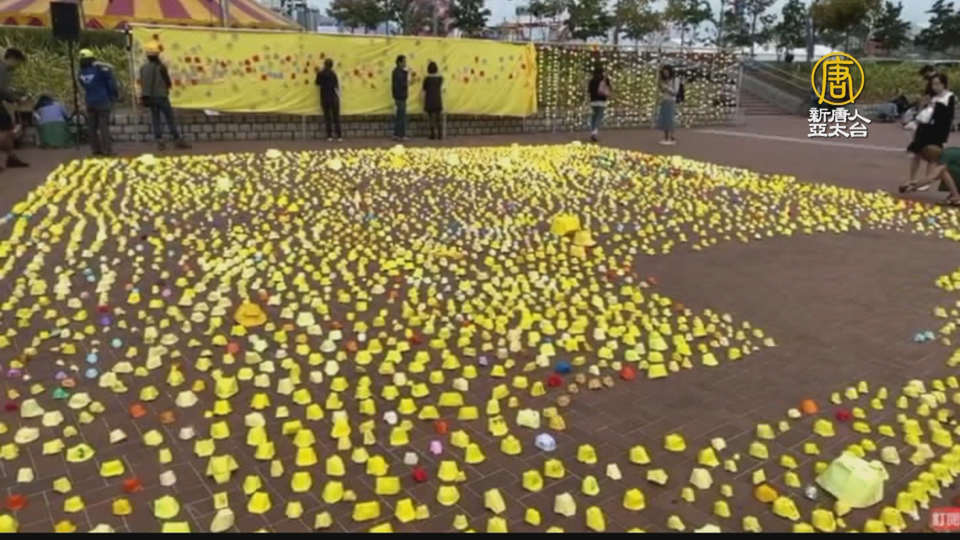 在中環愛丁堡廣場,參與罷工的人士在台前用黃色頭盔砌出「罷」字,並用顏色紙摺出眾多「頭盔」,喻意「堅持、守護」。