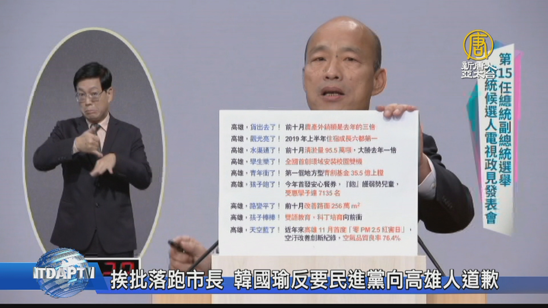 【新唐人亞太台 2019 年 12 月 18 日訊】再來看到,總統大選電視政見會,在剛剛八點半左右結束,三位候選人完成三階段總共30分鐘的政見說明。韓國瑜一開始就砲火猛烈,質疑蔡英文的國家認同、政府貪污。蔡英文則是反擊韓國瑜落跑,背棄市民,豪宅、主秘閨密爭議,都說不清楚。