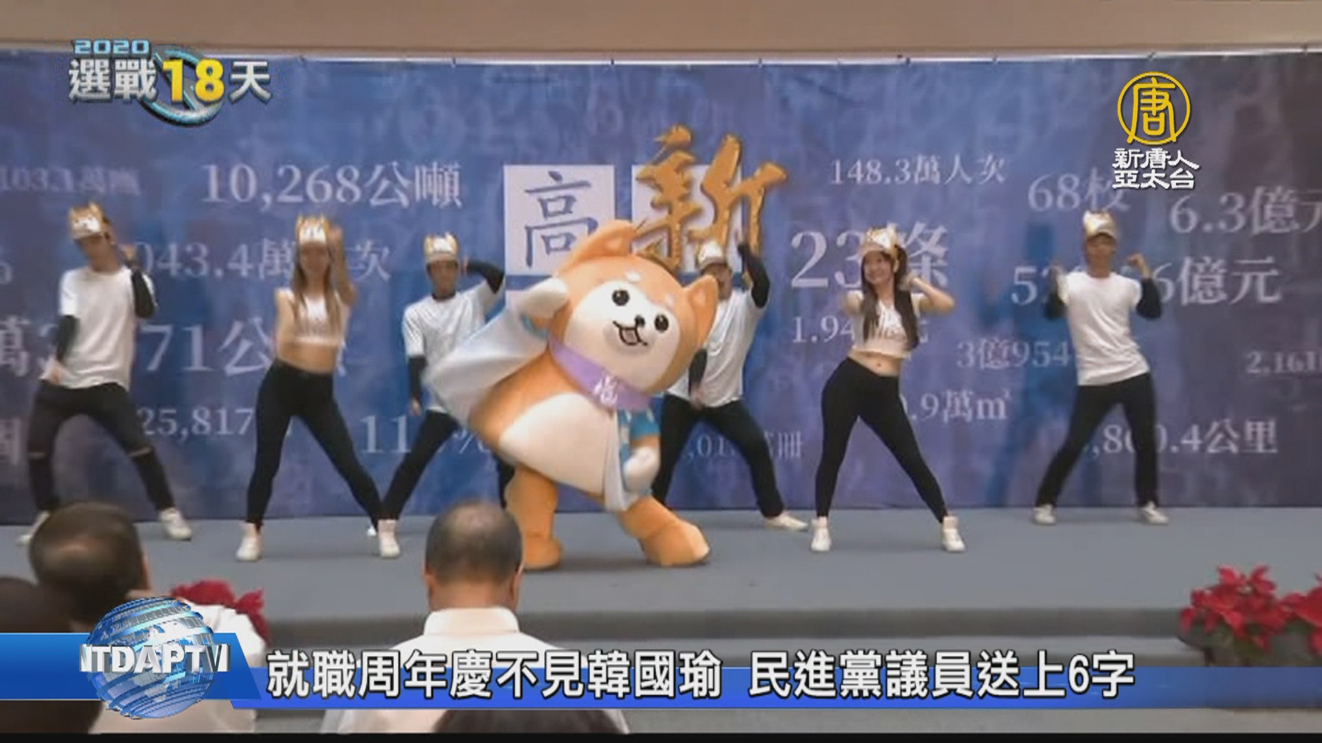 【新唐人亞太台 2019 年 12 月 24 日訊】高雄市長韓國瑜,今天就職滿周年,市府以「高雄新頁」為主題向市民說明施政成果,但市長本人沒有出席,而是由副市長葉匡時主持,讓在野議員很不滿,民進黨高雄市議會黨團,送給韓國瑜6個「年度關鍵字」。時力議員黃捷也發文諷刺,高雄「有個隱形的市長」。